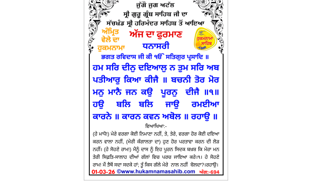 ਅੱਜ ਦਾ ਹੁਕਮਨਾਮਾ, ਸ੍ਰੀ ਦਰਬਾਰ ਸਾਹਿਬ, ਅੰਮ੍ਰਿਤਸਰ (1 ਮਾਰਚ 2026)